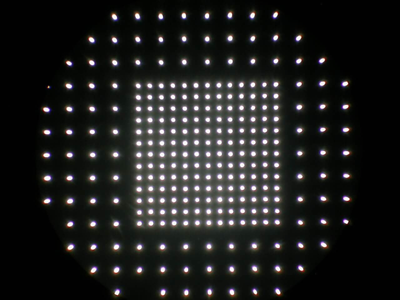 This hole array was created in stainless steel using an infrared laser. The material was 12 μm thick, and each hole had a diameter of 25 μm. The tolerance for hole diameter was +/- 2 μm.