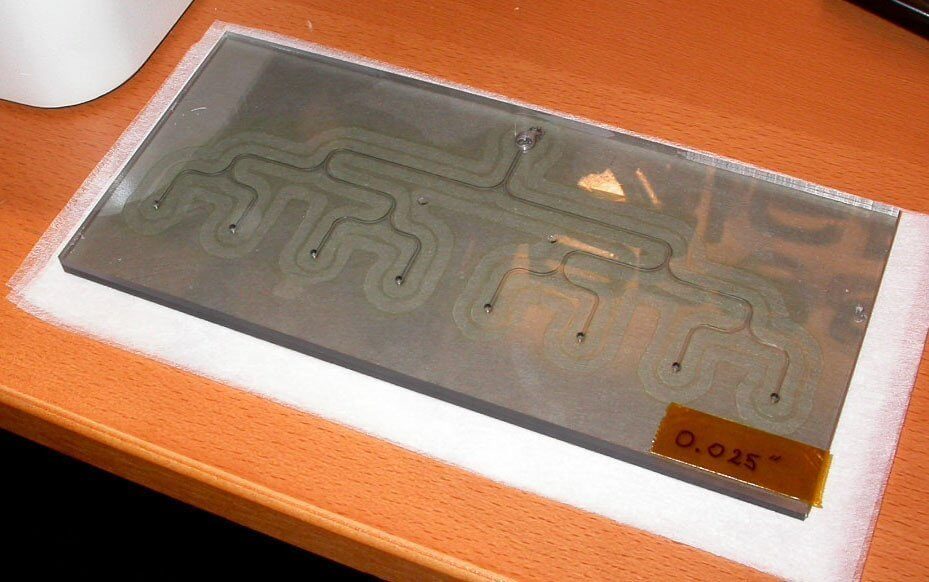 In the second project, two polycarbonate plates were laser welded together. The top (clear) piece featured via holes for inlet and outlet ports, while the bottom (tinted) piece featured micro-channels. The entire assembly was pressure and leak tested by Precision MicroFab.
