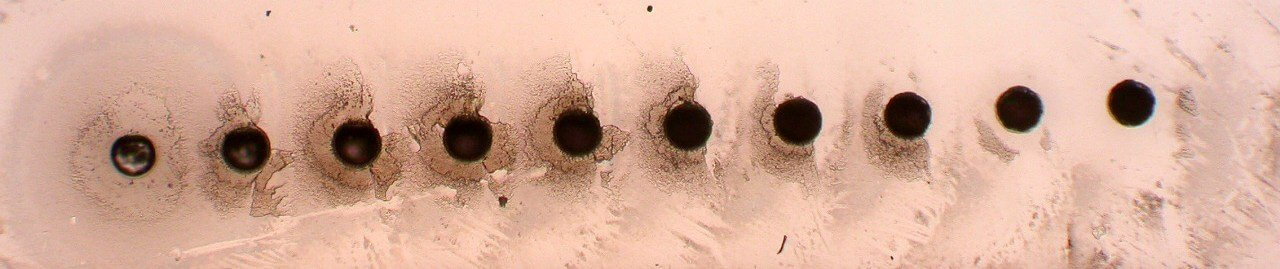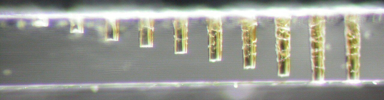 In the first picture, showing the two dimensional array, the hole pitch was 120 μm with 5 μm interstitial spacing. This tight spacing demonstrates our ability to drill holes very close together without cracking or shattering the walls in between.