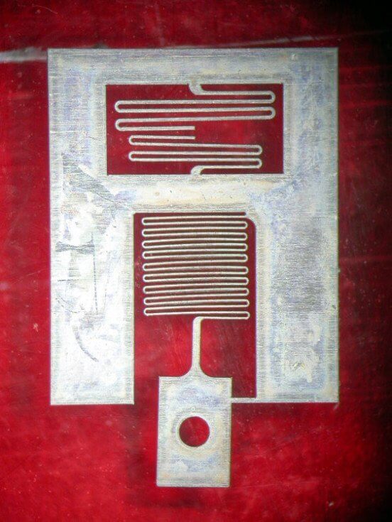 This micro G-force sensor, designed to measure microscopic G forces in an aerospace application, was cut from 25 μm thick aluminum. The smallest section of the spring is just 30 μm wide.