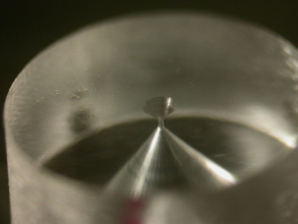 The next image shows a polycarbonate nozzle with a conical entrance and exit. The neck of the nozzle is 100 μm long and 100 μm in diameter. This nozzle was manufactured on our proprietary micro-mill.