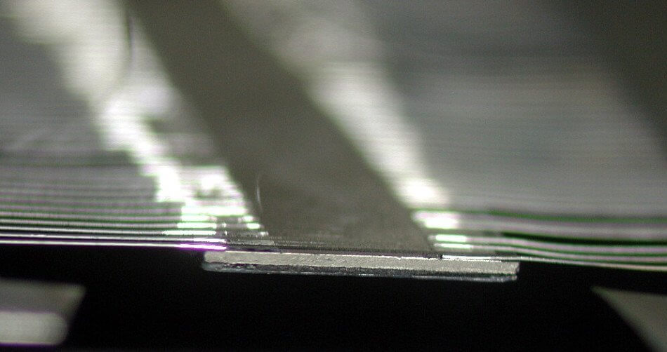 These 50 µm wide leads are laser soldered onto a thin metalized layer deposited on a ceramic substrate.